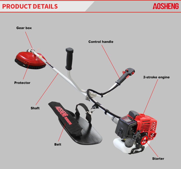 Enjin 4 lejang berprestasi tinggi, anjakan ialah 38CC. Penggunaan profesional di kawasan terbiar terbuka Saiz tiub 26mm * 1.5mm, aci fleksibel kekuatan. Lebar pemotongan ialah 420mm Masa h...